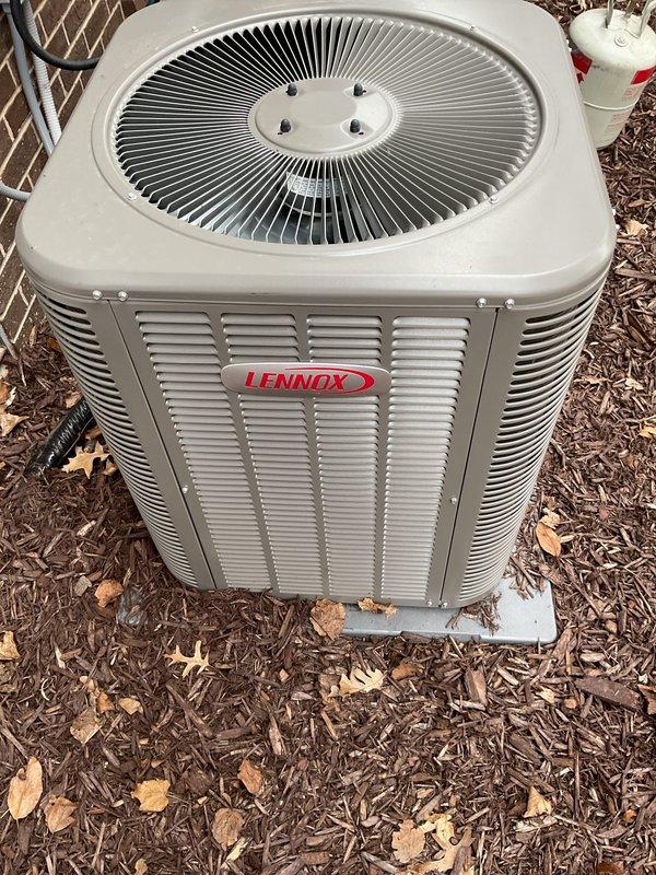 Performed seasonal startup on Lennox air conditioning unit #6 following recent installation of new furnace, A/C system, and thermostat. System had previously undergone nitrogen pressure testing and vacuum procedures but had not been operated due to weather conditions. Completed full AC startup procedures, verified unit operational status, and documented equipment condition with photos showing condenser unit properly positioned on concrete pad with adequate clearance.