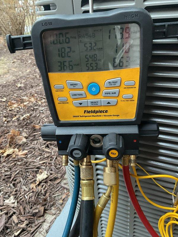 Performed seasonal startup and system diagnostic on Lennox residential air conditioning unit. Connected Fieldpiece digital manifold gauges to measure refrigerant pressures and temperatures across the system. All readings were within normal operating parameters, confirming proper refrigerant charge and system performance. Unit activated successfully and running as designed.