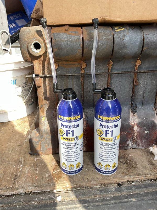 Replaced defective boiler heat exchanger under warranty service. Applied Fernox Protector F1 Express treatment to prevent future corrosion issues in system that showed significant rust and oxidation damage.