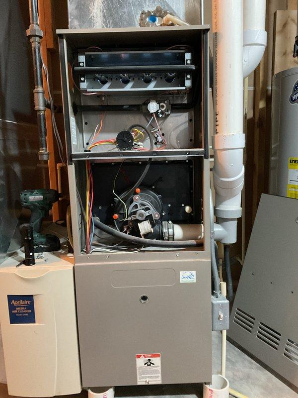 Responded to no-heat call for 2003 model furnace. Upon inspection, removed front panel to access internal components including blower motor assembly, control board, and heat exchanger. Diagnosed and serviced the system, restoring proper heating function.