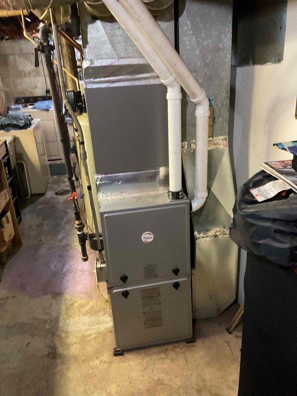 Responded to no heat call but found furnace operational upon arrival. Performed standard clean and check service on Payne furnace system located in basement. Inspected venting, ductwork connections, and associated plumbing components; all systems functioning properly.