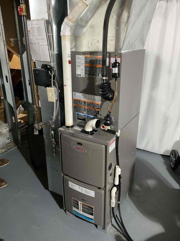 Performed diagnostic service on 2013 Lennox furnace system not maintaining temperature (57°F with thermostat set to 90°F). Conducted basic clean and check maintenance, including inspection of internal components, wiring, motor, and control board. System appears properly installed with appropriate gas connections and ventilation. Recommended further monitoring of heating performance.