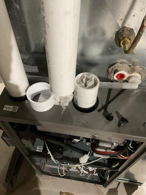 Responded to no heat complaint at new apartment complex installation (ML196UH070XE36). Diagnosed pressure switch failure due to blocked intake pipe. Cleared obstruction from PVC intake pipe and restored proper system operation.