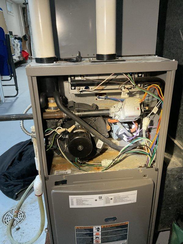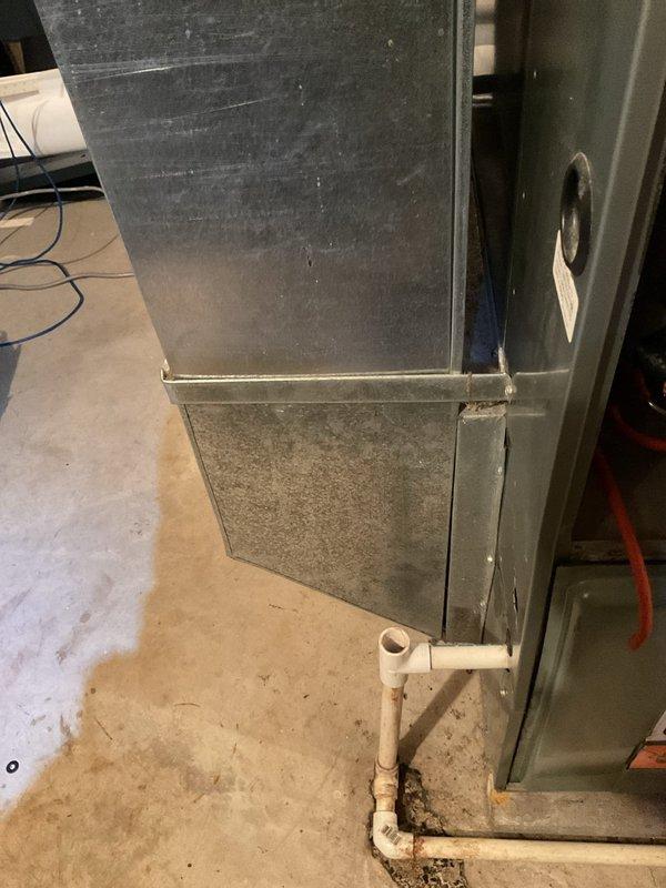Responded to no heat and water leak complaint for aging HVAC system. Upon inspection, removed front panel to access internal components and diagnosed failed blower motor as primary cause of heating failure. Repaired minor water leak from condensate drain line and performed system test to verify proper operation after repairs.