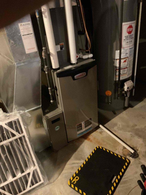 Responded to no-heat emergency call for Lennox Elite furnace. Diagnosed and cleared clogged condensate drain which was preventing system operation. Unit successfully restored to normal heating function.