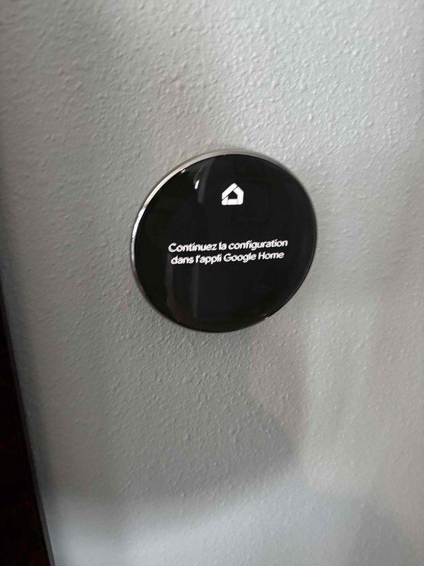 Installed and configured Google Nest thermostat at customer's residence. Mounted device properly on wall and initiated setup process. Left system ready for final configuration through the Google Home app.
